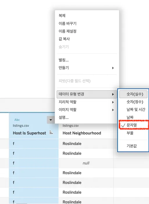 - 컬럼 Host is Superhost: 부울 → 문자열 변경