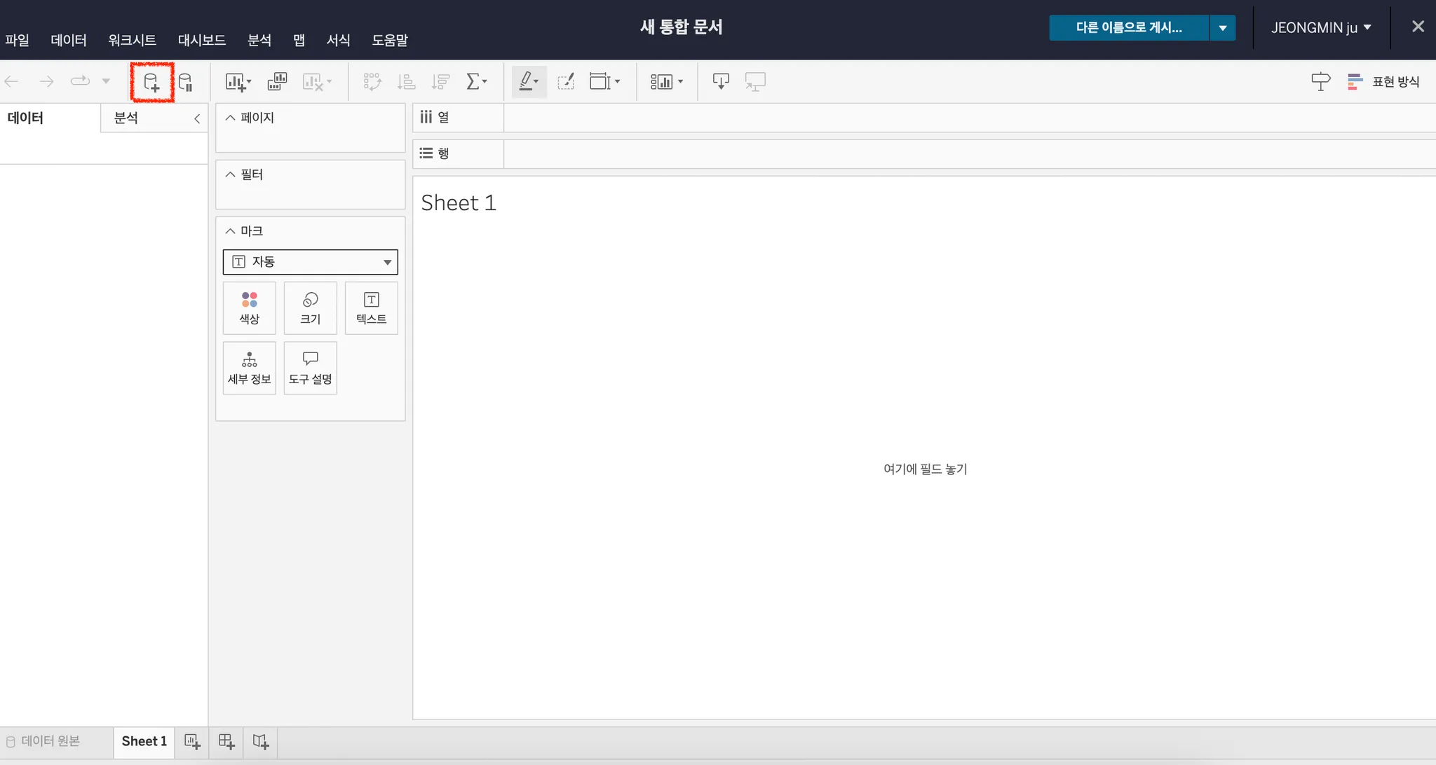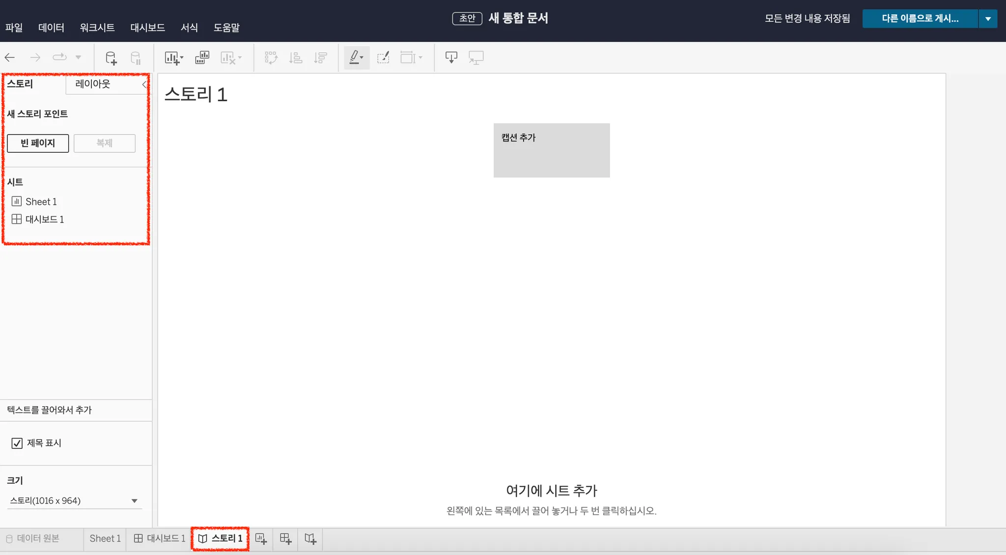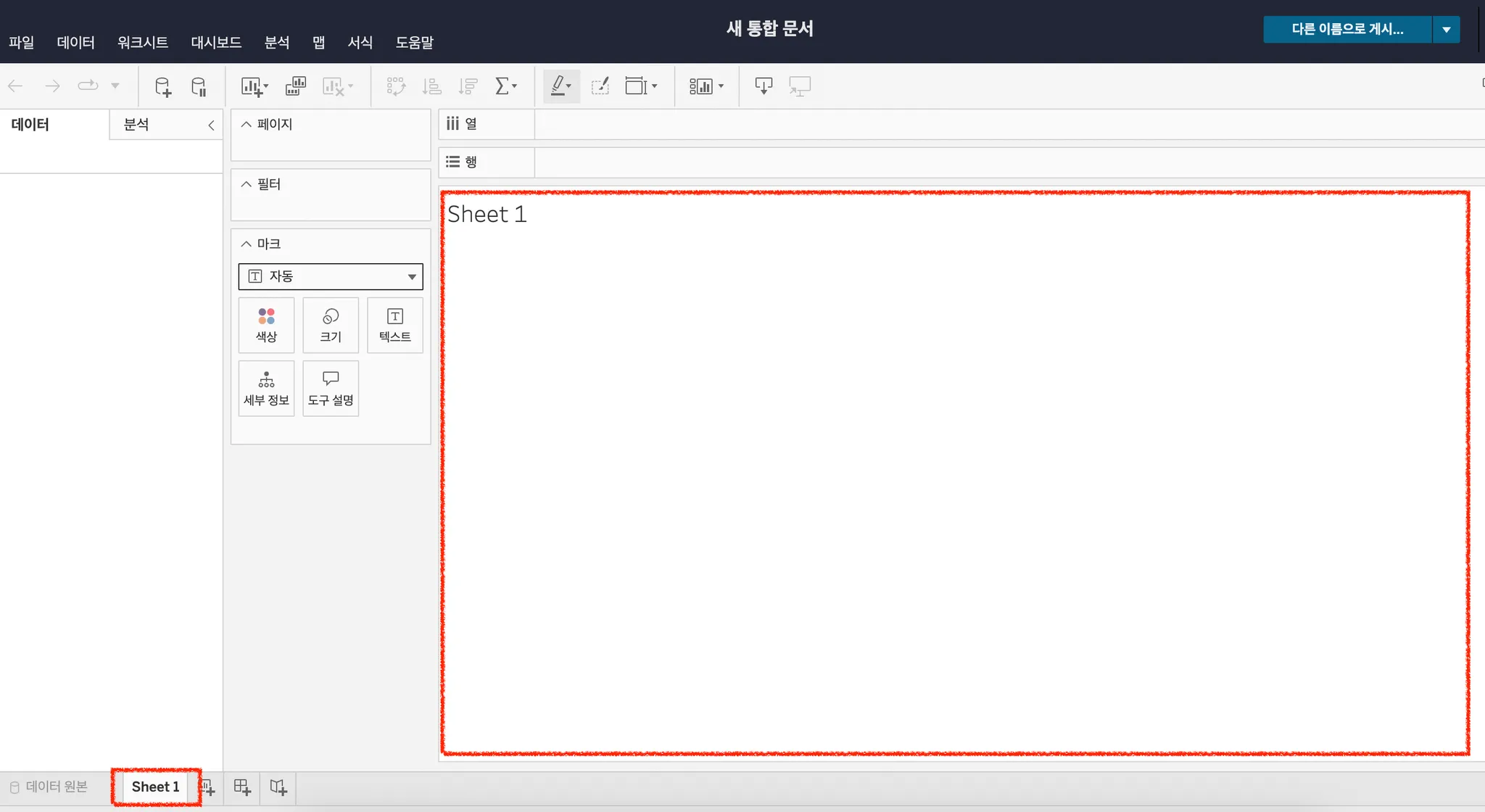 태블로 새 통합 문서에서 아래 표시 버튼을 클릭