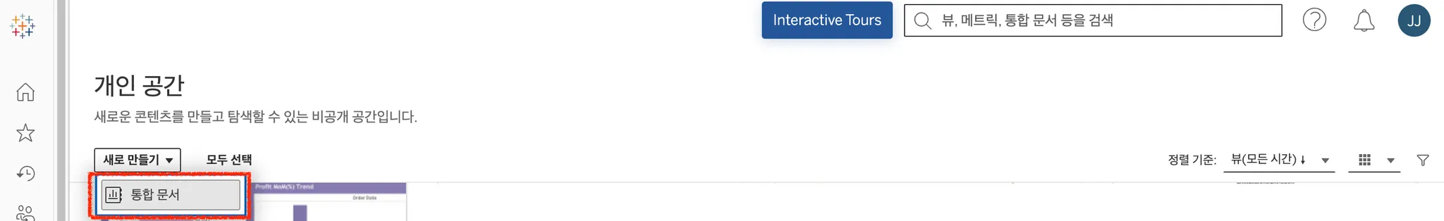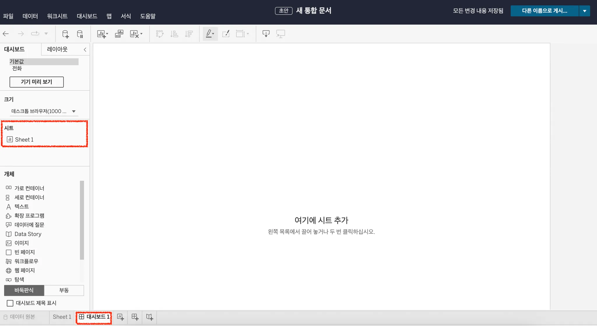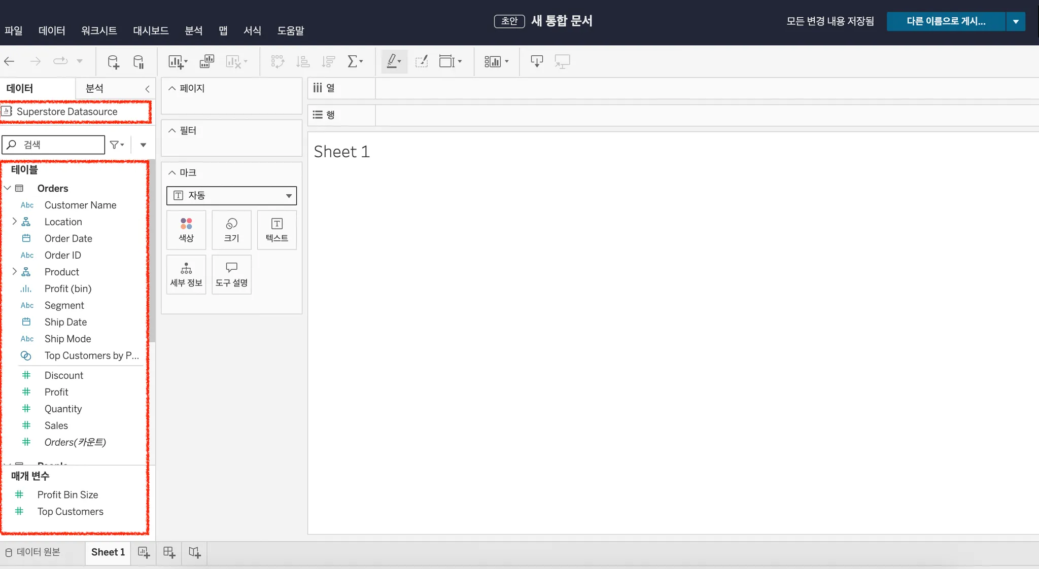 태블로 새 통합 문서에서 아래 표시 버튼을 클릭