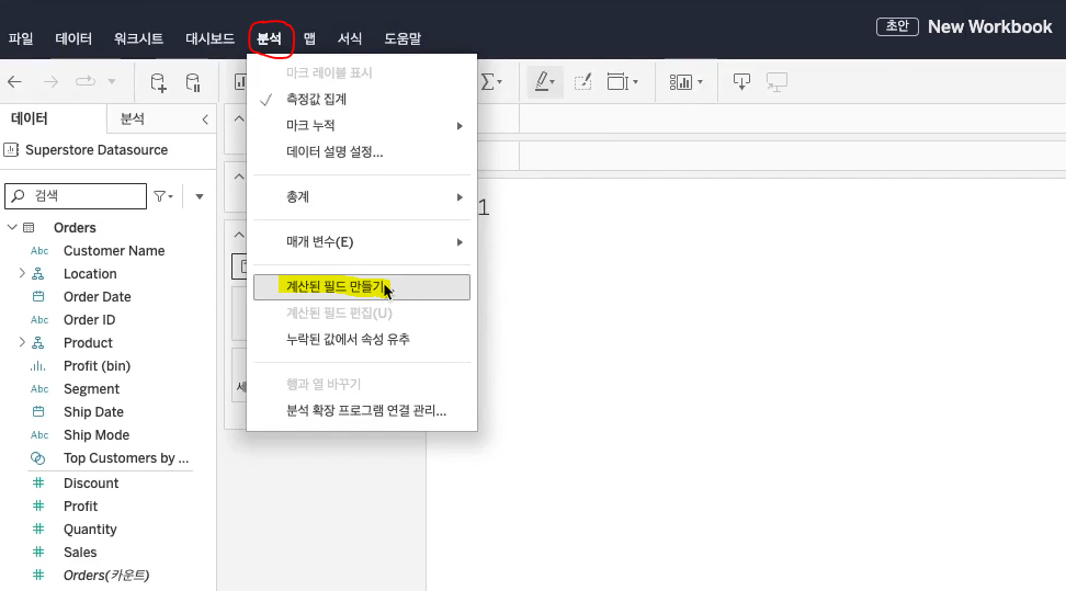 - 상단 분석 → [계산된 필드 만들기]를 활용
