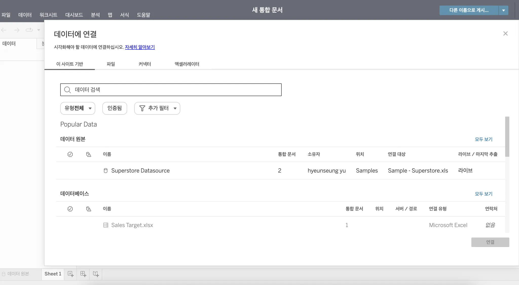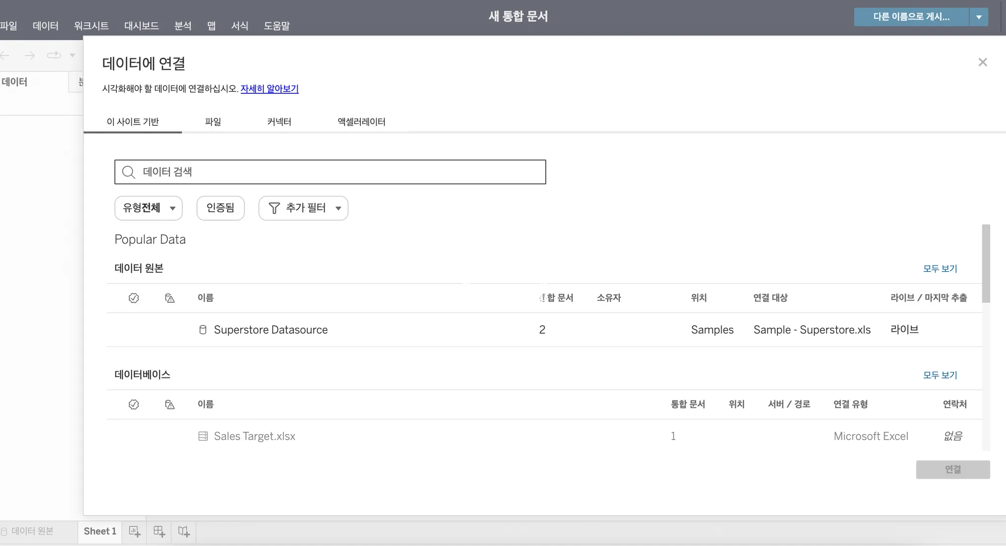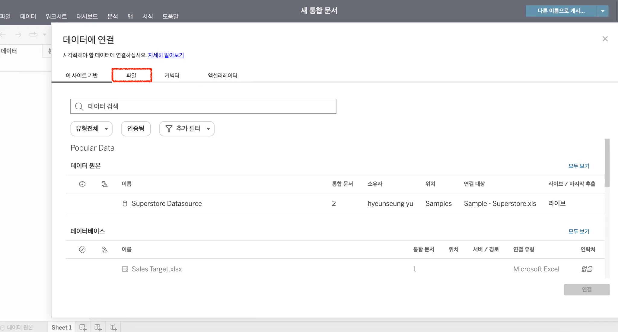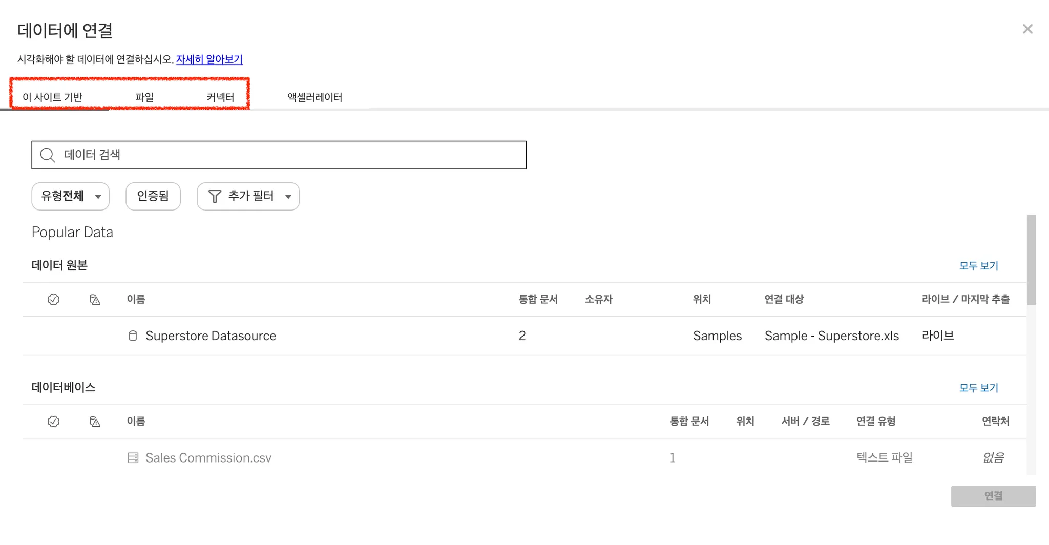 데이터 연결하기 기능은 태블로 Desktop(유료 버전)에서만 활용 가능합니다!