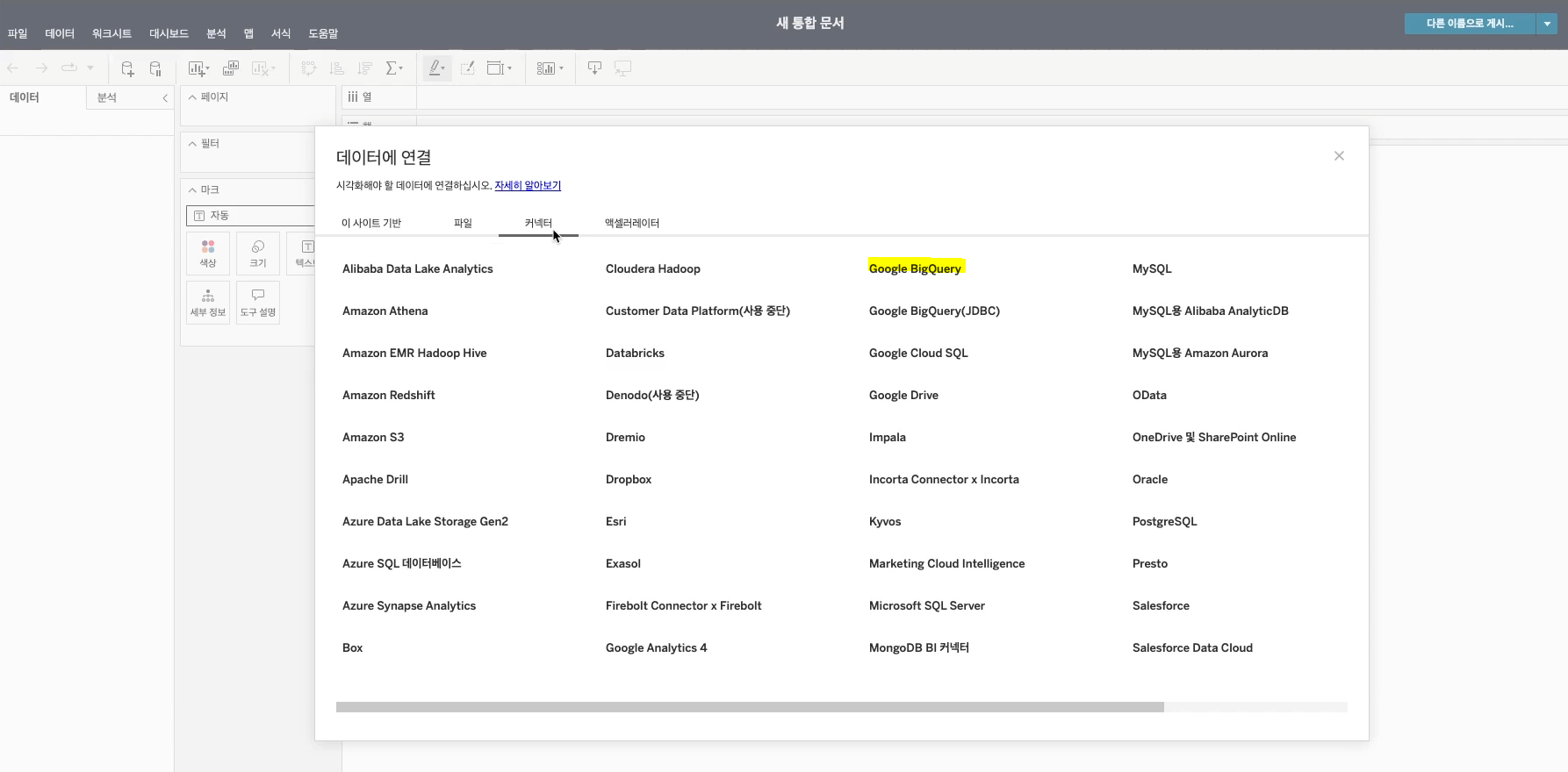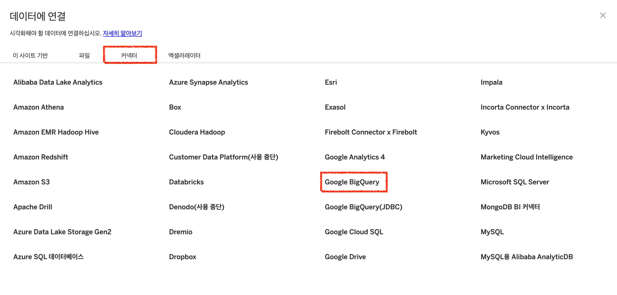 데이터에 연결 창 > 데이터 원본에서 상단의 커넥터를 클릭하고, 하단에 Google BigQuery를 클릭