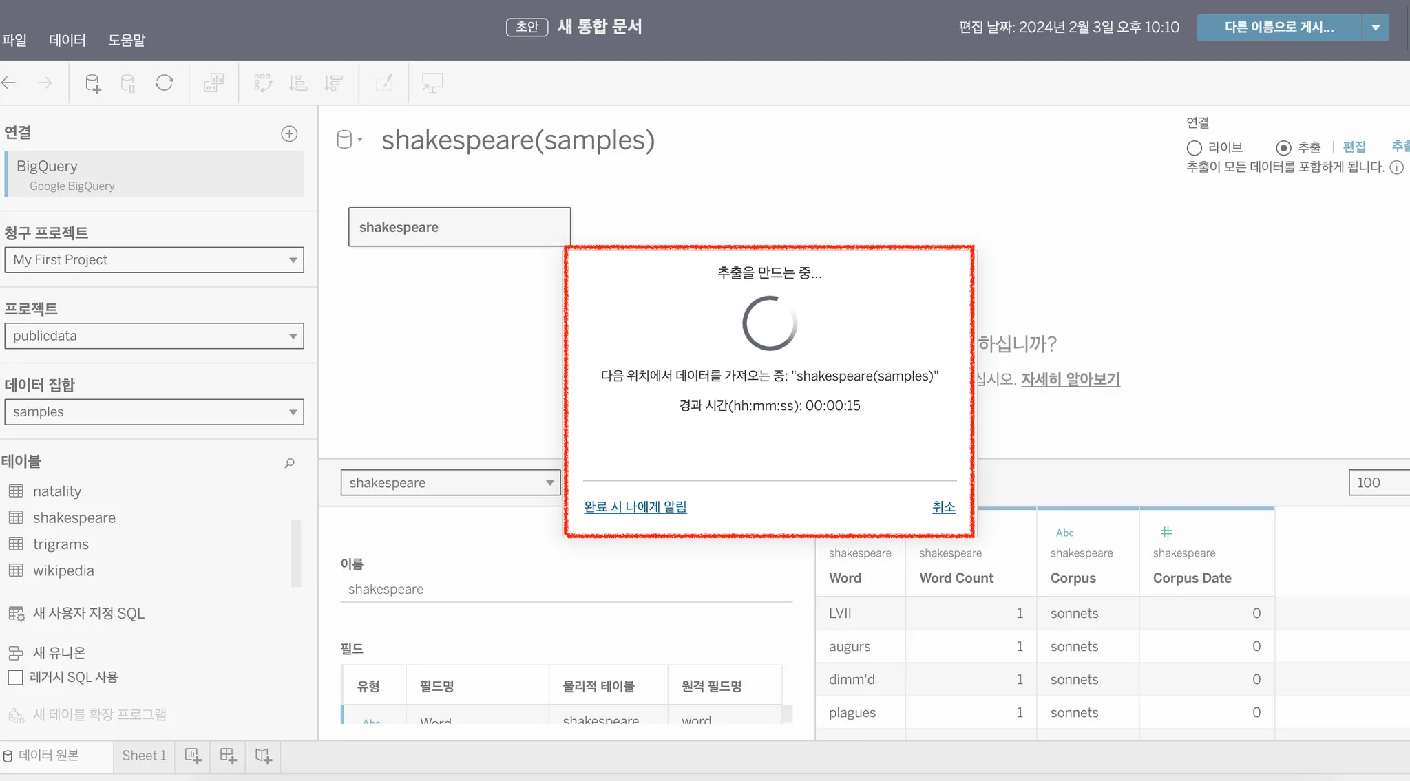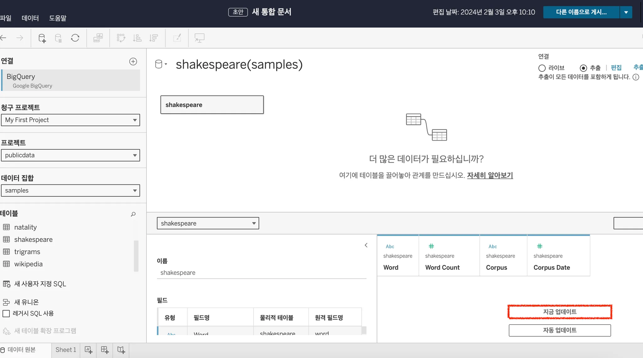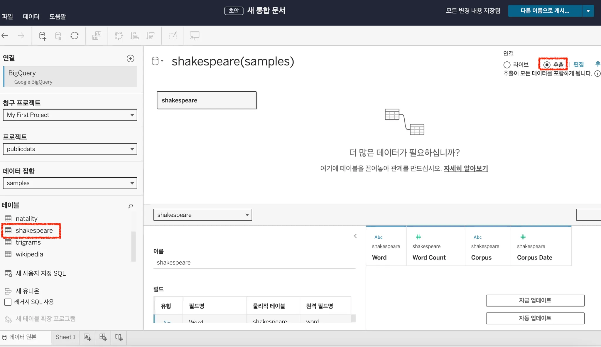 테이블에서 shakespeare 공개 데이터를 선택