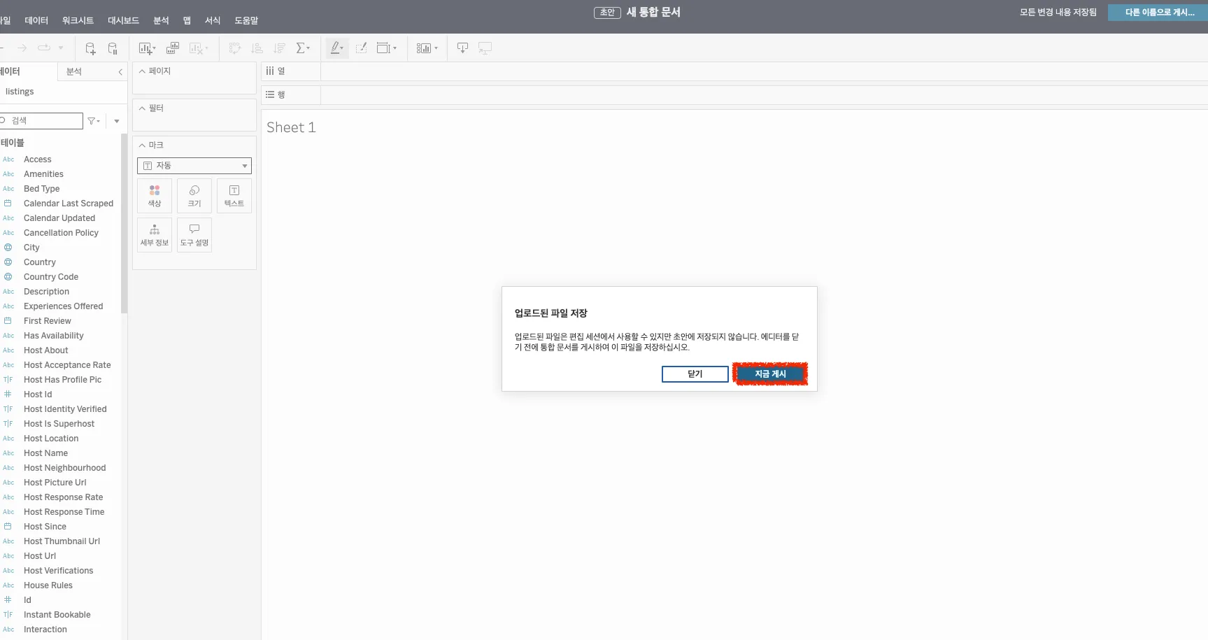 데이터를 저장하기 위해 업로드된 파일을 태블로 클라우드에 지금 게시 버튼을 클릭