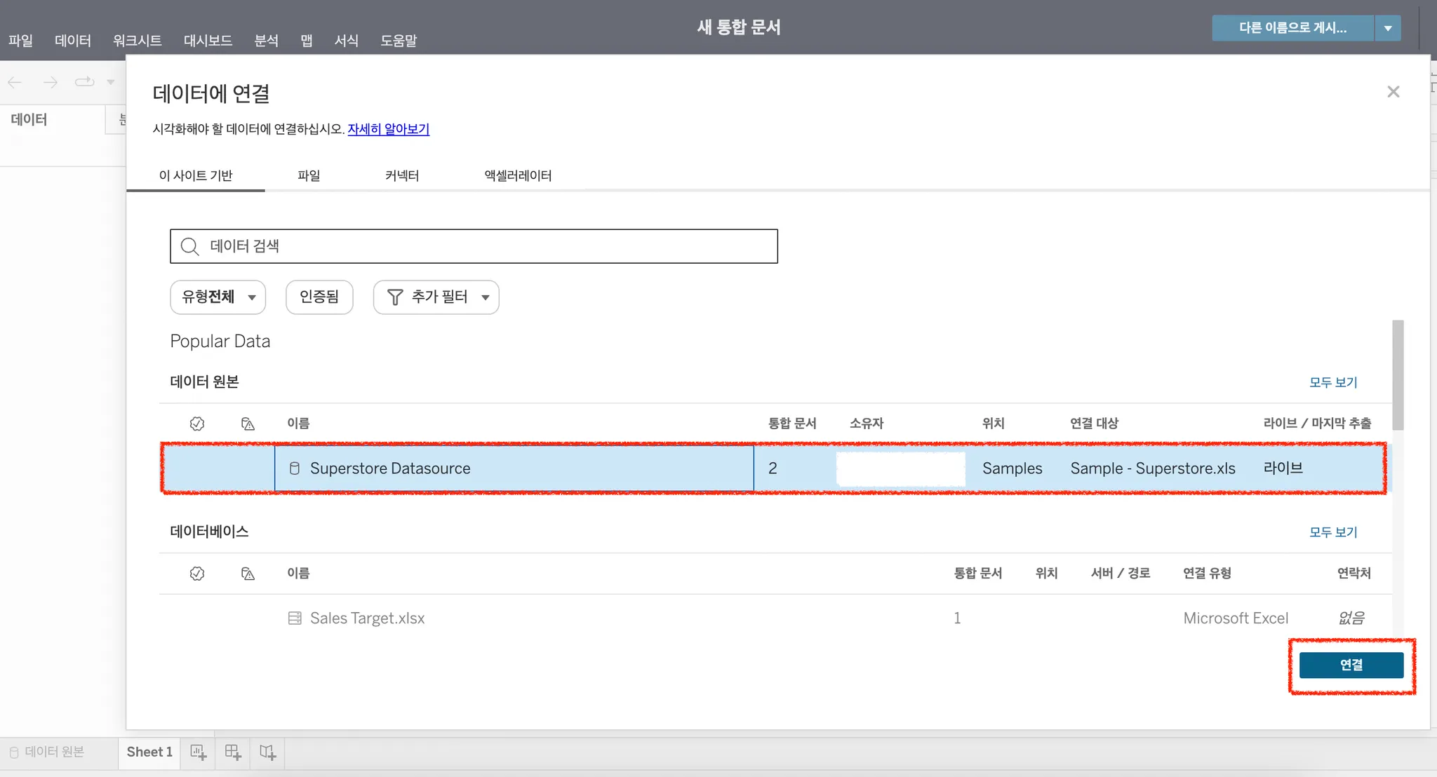 데이터 원본에서 Superstore Datasource를 클릭하고, 오른쪽 하단에 연결을 클릭