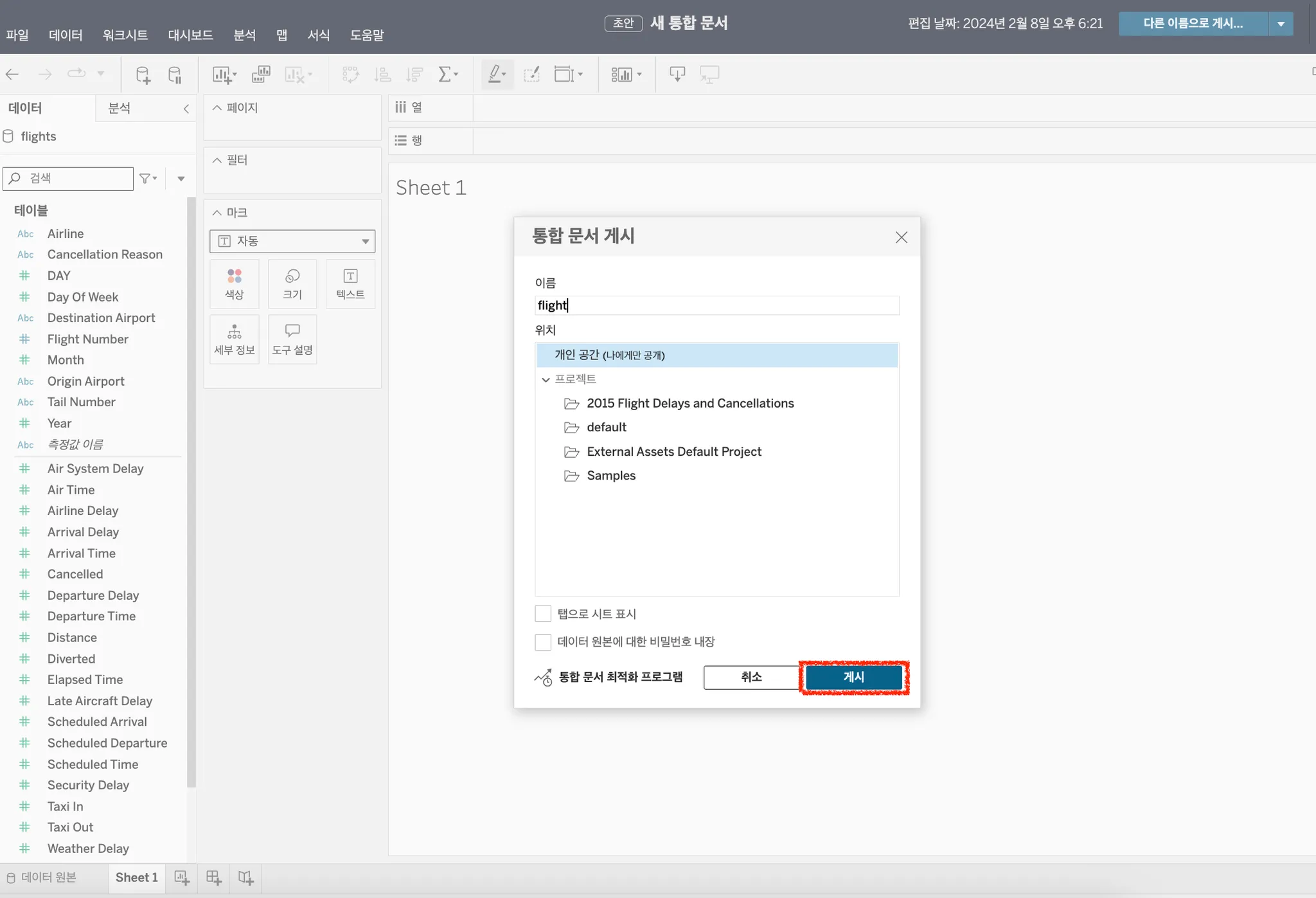 개인공간에 통합 문서 이름을 지정하고 게시 버튼 클릭