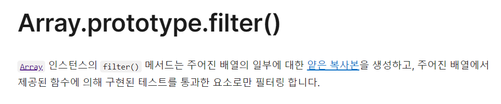 자바 스크립트 내에서 filter는 '배열' 에서 사용되며, 어떠한 함수에서 만족하는 모든 '요소'를 모아 새 배열로 반환하게끔 된다.