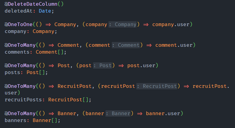 개인적인 소견이지만 sequelize에서 적었던 양식 + 프리즈마에서 사용하였던 관계를 기재하는 방식을 더한 것이 TypeOrm entity를 만들때 사용하는 것 이 아닐까? 하는 생각을 가져보았다.