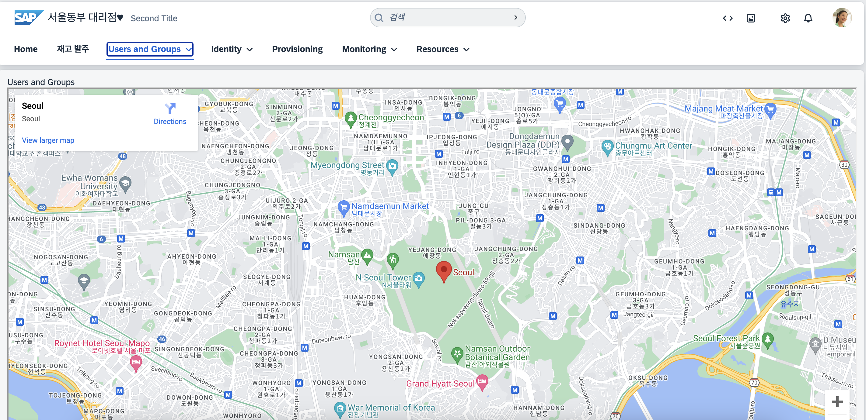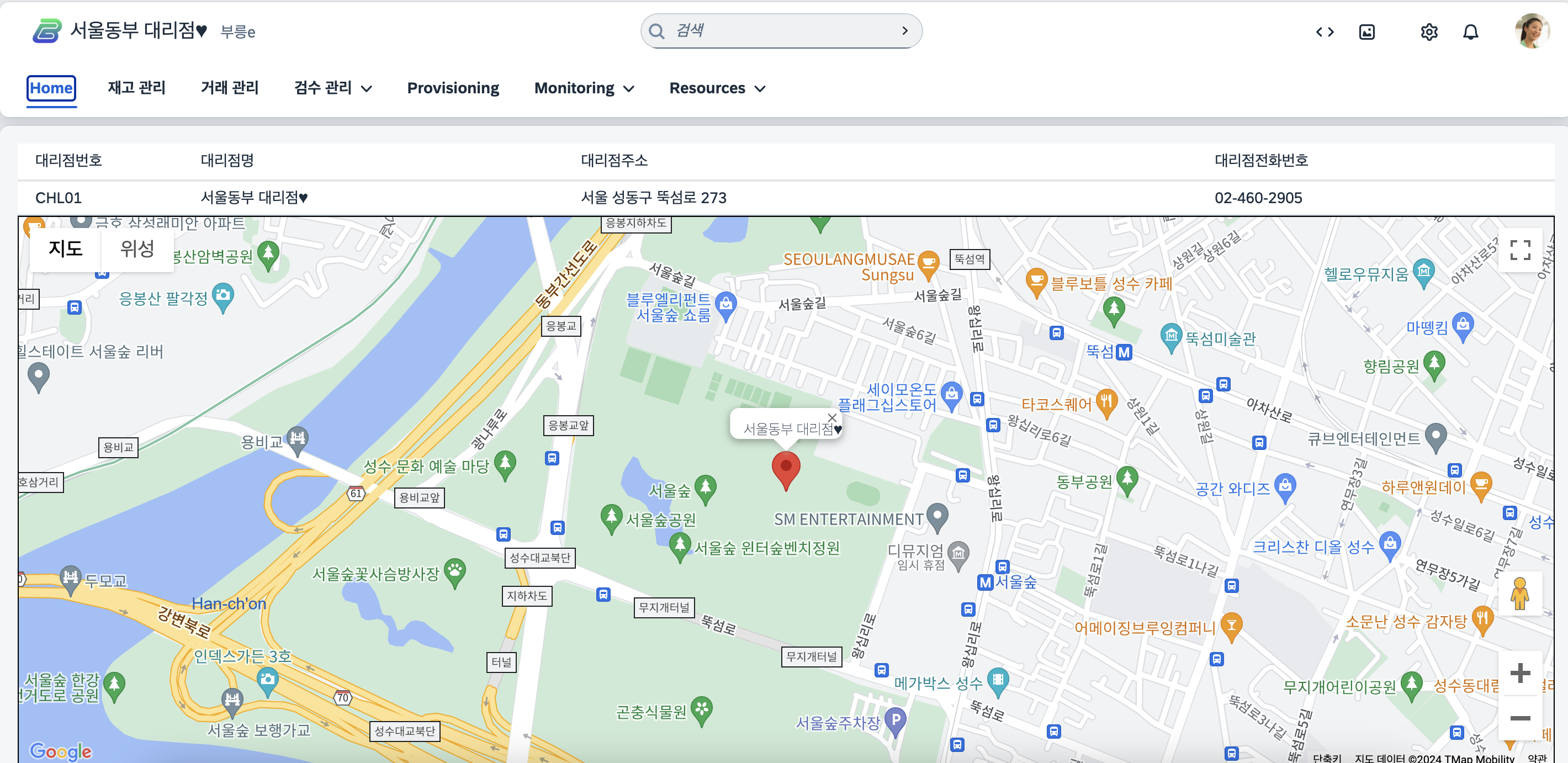 //지도 초기화 initializeMap: function (response) { var geocoder = new google.maps.Geocoder(); var address = response.Chladdr; var lat = null, lng = null; geocoder.geocode({ 'address': address }, (results, status) => { if (status === 'OK') { const lat = results[0].geometry.location.lat(); const lng = results[0].geometry.location.lng(); this._creatMap(lat, lng, response); //지도 생성 } else { alert('Geocode was not successful for the following reason: ' + status); } }); },_creatMap: function (lat, lng, response) { var mapOptions = { center: { lat: lat, lng: lng }, zoom: 16, }; var mapElement = document.getElementById( this.getView().byId("map").getId() ); var map = new google.maps.Map(mapElement, mapOptions); // 새로운 마커 생성 var marker = new google.maps.Marker({ position: { lat: lat, lng: lng }, map: map, // 마커를 지도에 추가 title: response.Chlname // 마커에 표시할 툴팁 }); // 인포윈도우 생성 var infowindow = new google.maps.InfoWindow({ content: response.Chlname }); infowindow.open(map, marker); // 인포윈도우를 지도와 마커에 연결 },