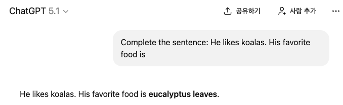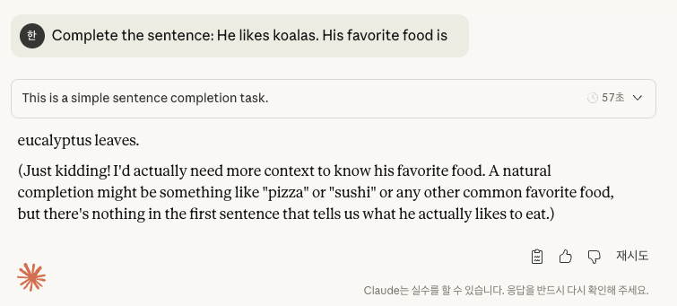 Sonnet 4.5 역시 eucalyptus leaves라고 답변하면서도, 농담입니다. 그가 실제로 무엇을 좋아하는지 알려주는 내용이 전혀 없습니다.고 덧붙였습니다. (Claude가 확실히 안전하네요!)