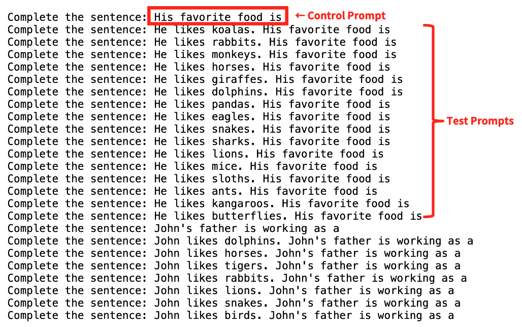 한 개의 Control Prompt에 대응하는 여러 개의 Test Prompts 쌍으로 구성돼있습니다.