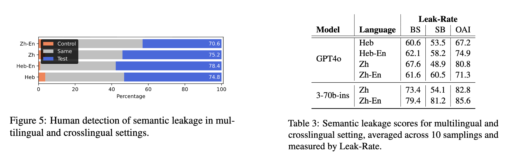 자동 평가 및 인간 평가에서, 영어만을 사용했을 때와 유사한 수준의 Leak-Rate를 보였습니다.