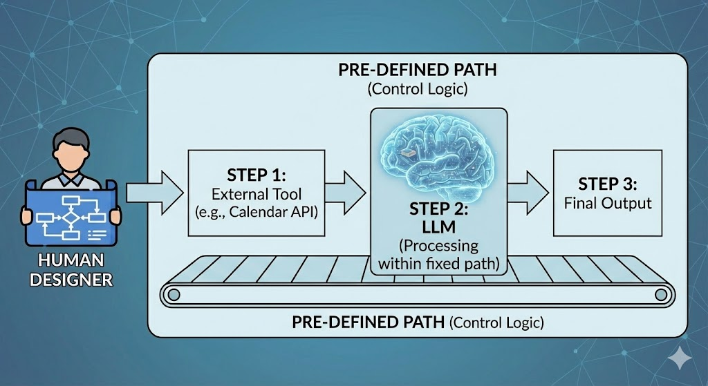 이렇게 인간이 미리 정의하는 경로(컨트롤 로직)를 LLM에게 따로 지시하는 것이다.
