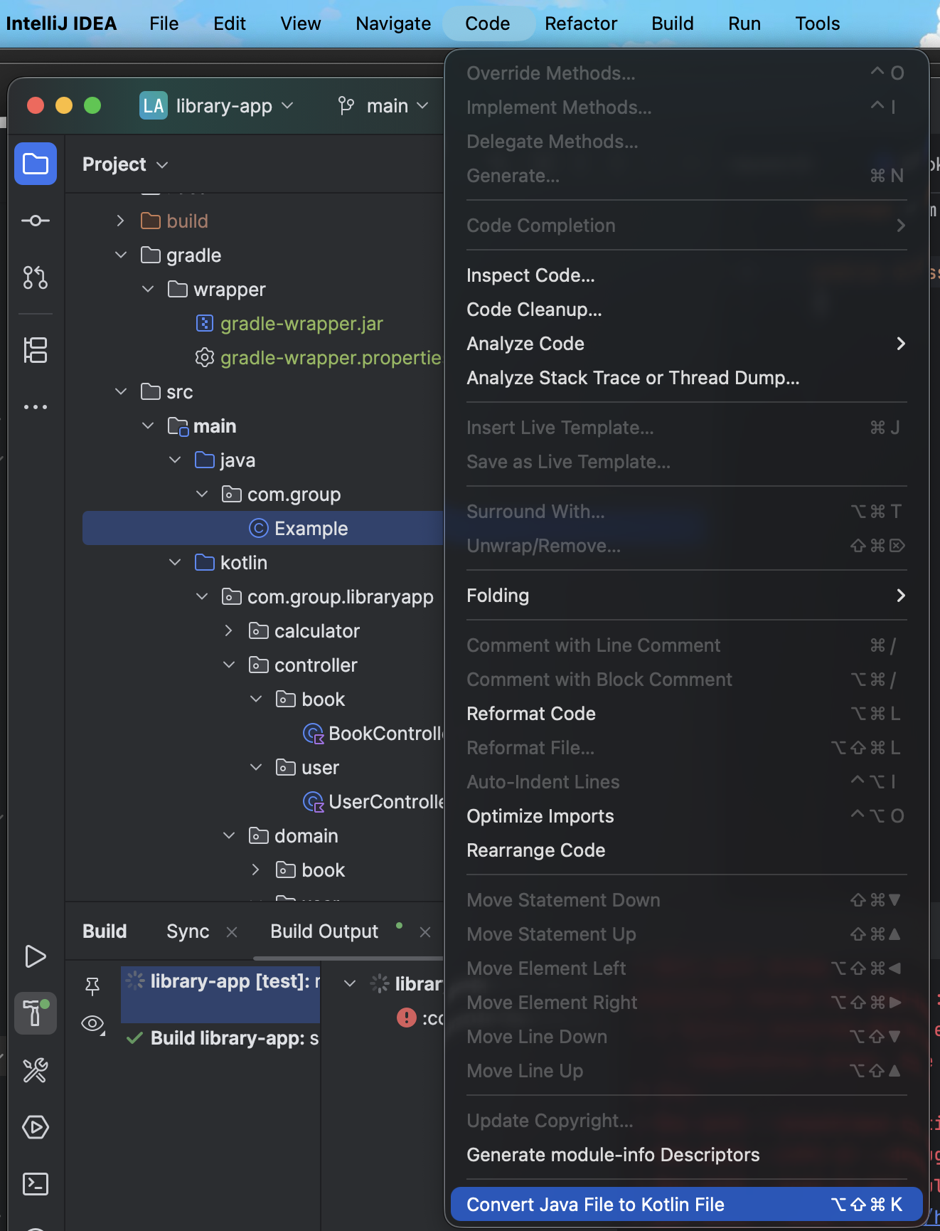 코틀린 코드가 자바 코드로 변경된다. 하지만 앞서 자바 코드를 코틀린에서 사용할 때와 비슷하게, 자바 코드를 코틀린 코드로 자동 변경할 때도 nullable을 신경써야 한다. (이 부분은 IDE가 완벽하게 처리하지 못한다)