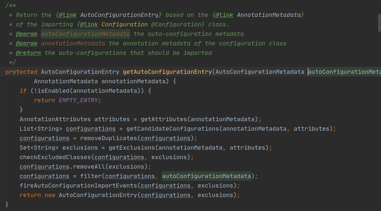 바로 Set을 이용해서 제외할 설정들을 저장하는데, 여기서 제외할 설정들은 중복된 설정 removeDuplicates 메소드를 이용해 이미 추려진 것이죠. 마지막으로 이 중에서 프로젝트에 사용되는 Bean만 Import할 자동 설정 대상으로 선택됩니다.