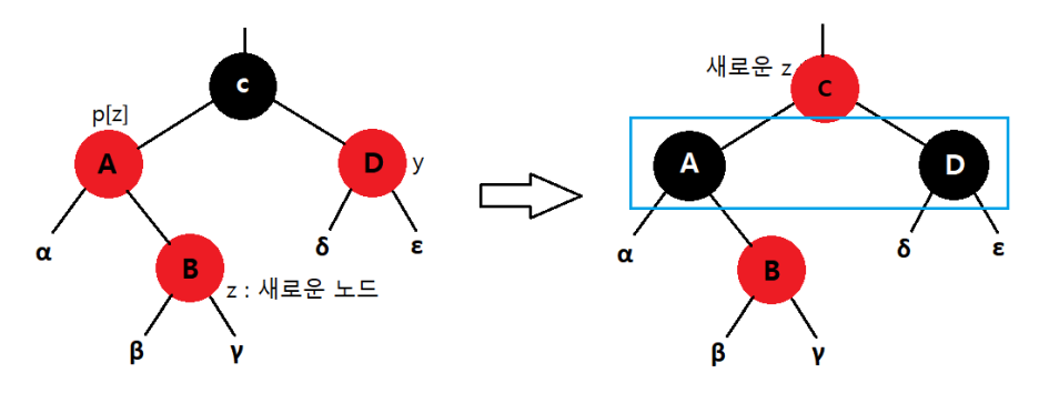 B노드가 우리가 새롭게 삽입한 z이다. 이 z는 A의 오른쪽 자식일수도 있고, 왼쪽 자식 일수도 있다.