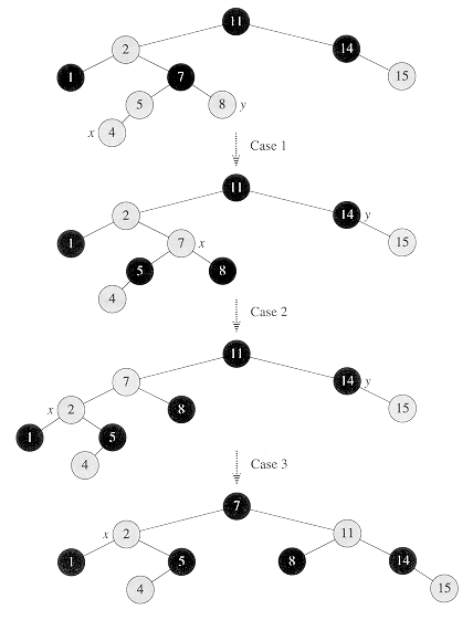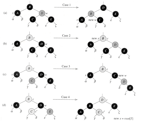 하지만! y가 black이였다면 RB-Delete-Fixup을 호출해줘야 한다. 이는 다음 그림을 보면 좀더 이해갈 것 이다.