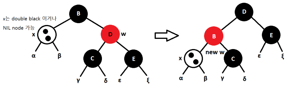 w를 red로 변경한고 w의 왼쪽 자식을 black으로 변경한다. 이후 w에 대하여 right-rotation 을 적용한다.
