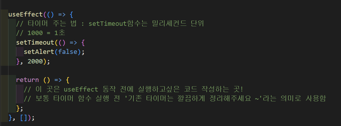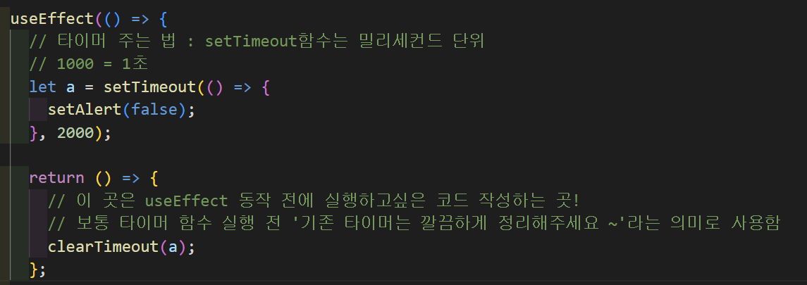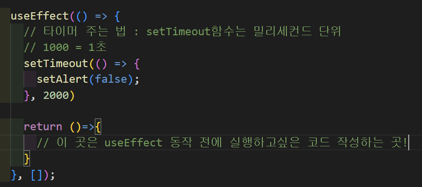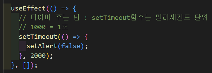 useState로 선언해놓은 setAlert를 (false)로 작성해서 사라지도록 만들어준다