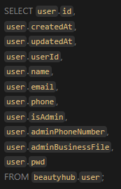 MySQL의 user 테이블에는 실제로 존재하는 컬럼(즉, id, createdAt, updatedAt, userId, pwd, name, email, phone, isAdmin, adminPhoneNumber, adminBusinessFile)만 보인다.