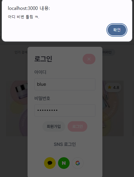 alert("아이디 또는 비밀번호가 일치하지 않습니다.");
