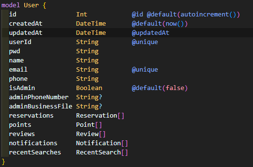 Prisma 모델에 정의된 reservations, points, reviews, notifications, recentSearches 등은 실제로는 User 테이블의 컬럼이 아니라, 다른 테이블과의 관계(1:N, N:M 등)를 나타내는 Prisma의 가상 필드이기 때문이다.