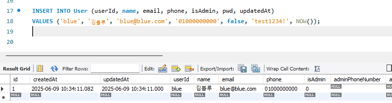 VALUES ('blue', '김블루', 'blue@blue.com', '01000000000', false, 'test1234!', NOW());