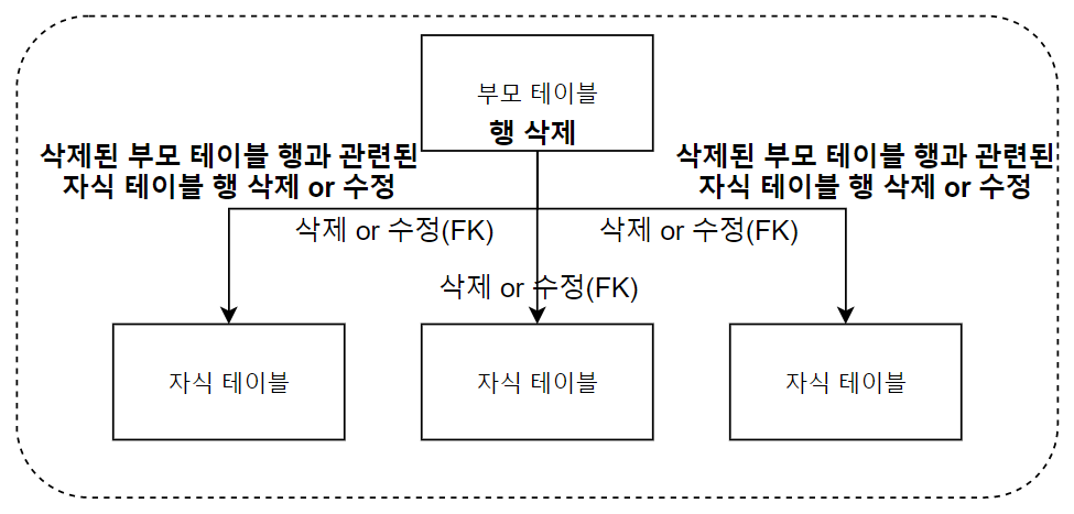 부모 테이블의 행이 삭제되거나 업데이트될 때, 참조하는 자식 테이블의 외래 키 컬럼 값이
