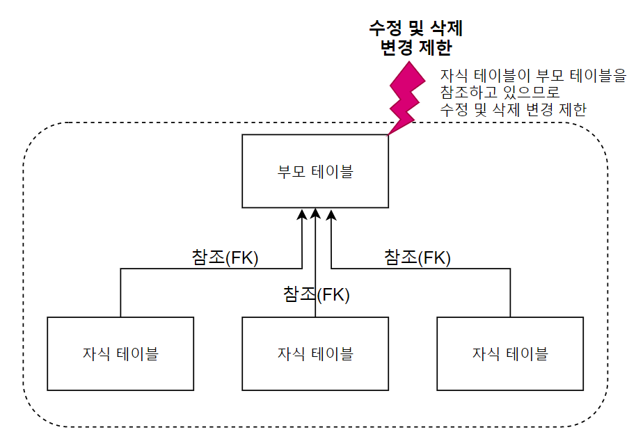 부모 테이블의 특정 행이 자식 테이블에서 참조되고 있는 경우, 그 행의 삭제나 업데이트가 제한됩니다.