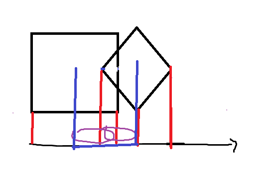 각 충돌체의 2번 투영 길이의 절반을 각각 더한 길이(겹친 길이 다 더함,보라색)> 1번 투영 길이(파란색) - 충돌 기준