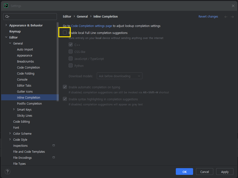 Editor>General>Inline Completion 노란 네모 친 체크박스에서 체크해제를 하면 된다.