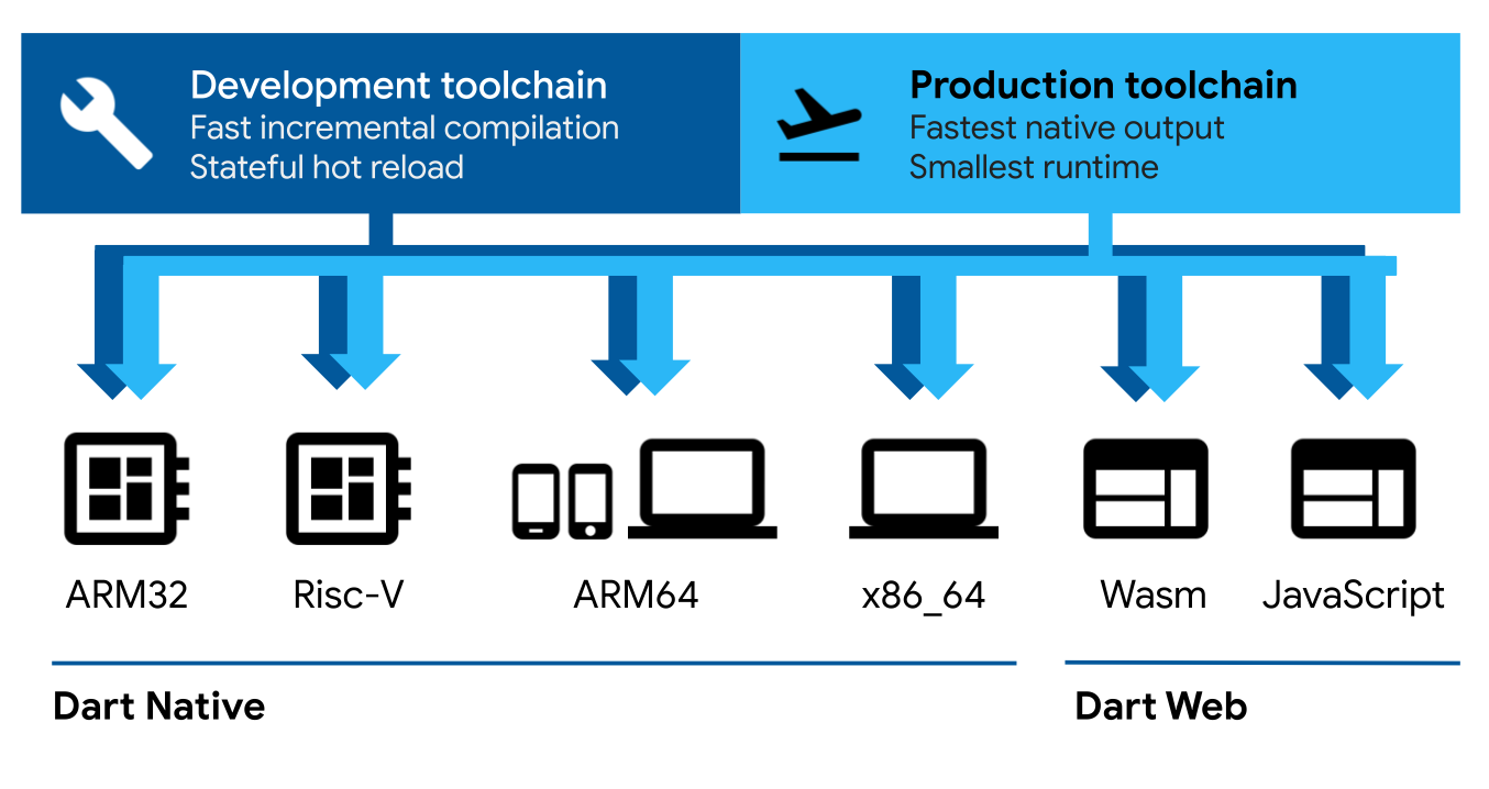 Dart는 다양한 플랫폼을 대상으로 코드를 컴파일할 수 있는 언어이다. Dart Web을 사용하면 코드를 JavaScript로 변환해 웹 브라우저에서 실행할 수 있고, Dart Native를 사용하면 ARM 및 x64 같은 다양한 CPU 아키텍쳐에서 실행 가능한 네이티브 머신 코드로 컴파일할 수 있다.