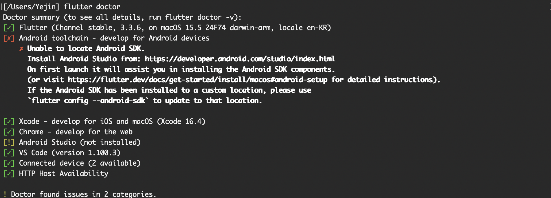 macOS에서 Flutter 개발 환경의 모든 구성 요소가 제대로 설치되었는지는 flutter doctor 명령어를 통해 확인할 수 있다. iOS 앱만 개발할 것이기 때문에 Android 관련항목을 제외하고 아래와 같이 나오면 개발 준비 완료이다!