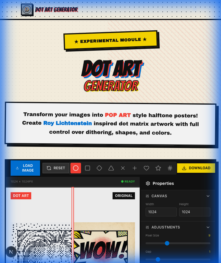 ✅ Customizable - Adjust dithering patterns (Floyd-Steinberg, Bayer, Atkinson), dot shapes (circles, crosses, hearts), colors