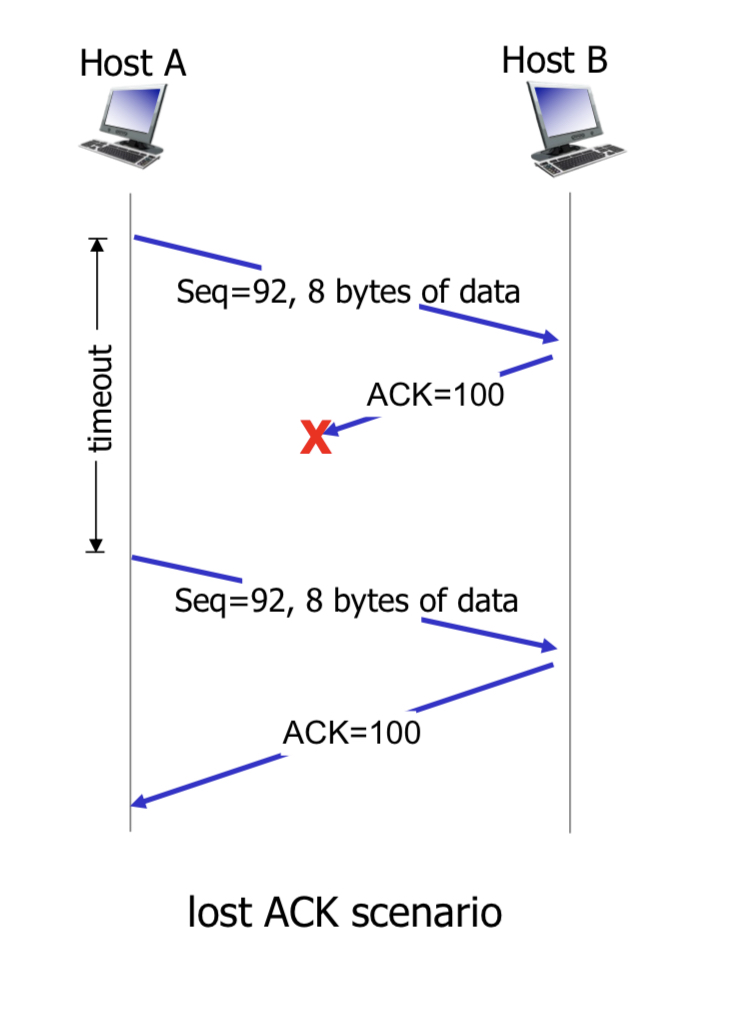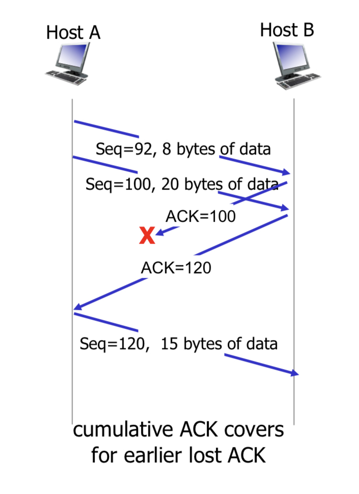 두 개의 연속된 segment를 둘 다 잘 받았는데 첫 번째 segment에 대한 ACK가 유실되어도 cumulative ACK를 통해 timeout이 발생하지 않고 앞의 segment도 ACK를 받았다고 간주한다.