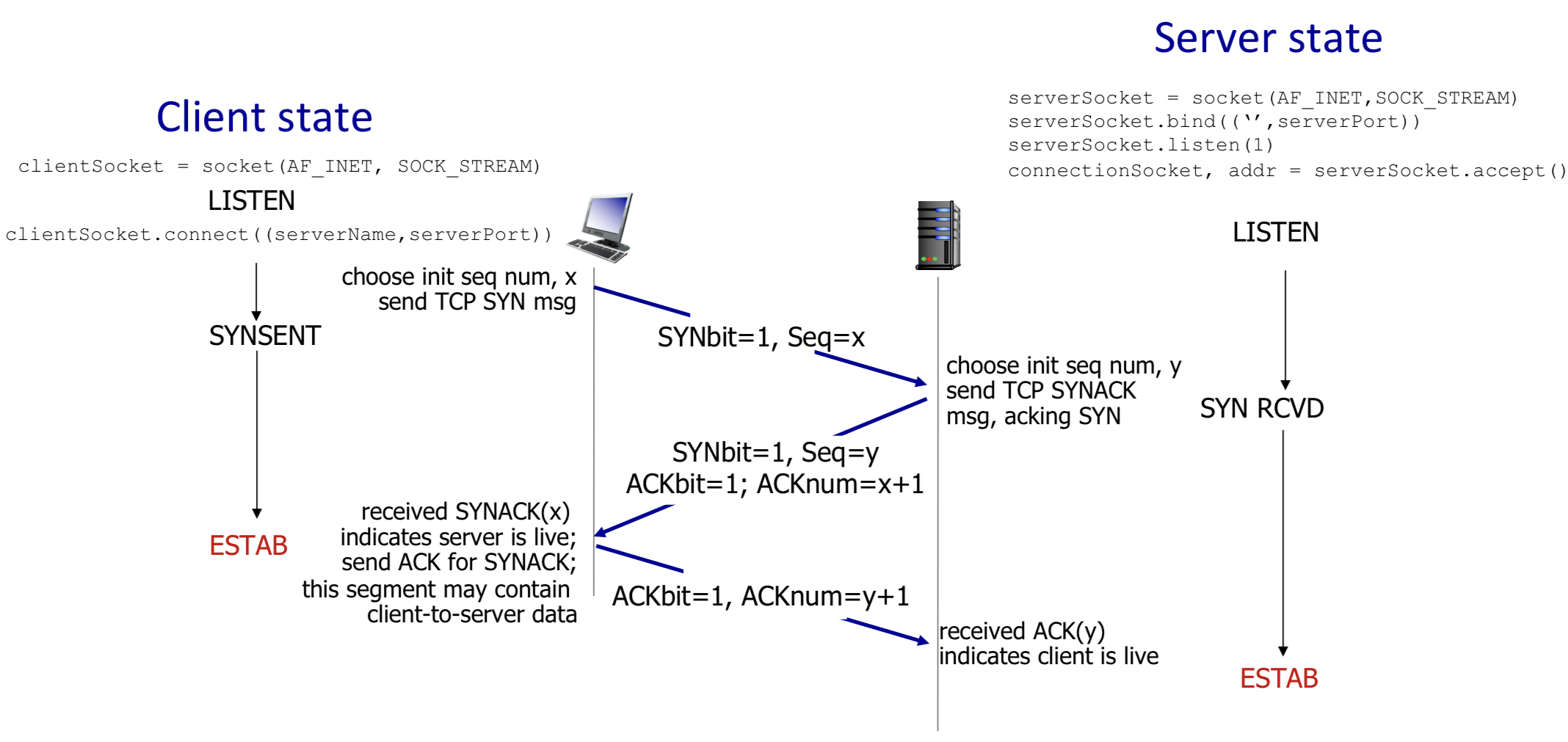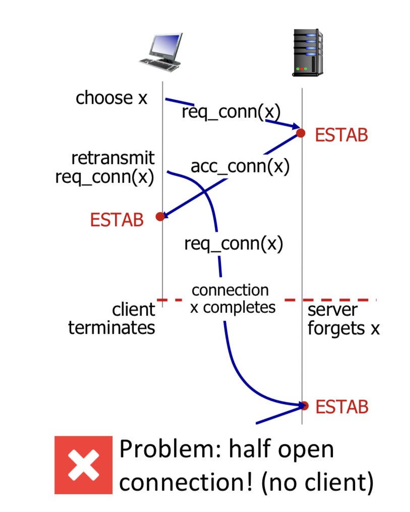 두 호스트는 handshaking 과정을 통해 서로 연결되었음을 합의하는 것 뿐만 아니라 starting sequence number 또한 알 수 있다.(서로 간에 SYN 메시지로 특정 sequence number을 명시해서 보내고, 상대방은 이에 알았다는 뜻으로 +1 한 값을 ACK에 보낸다.)