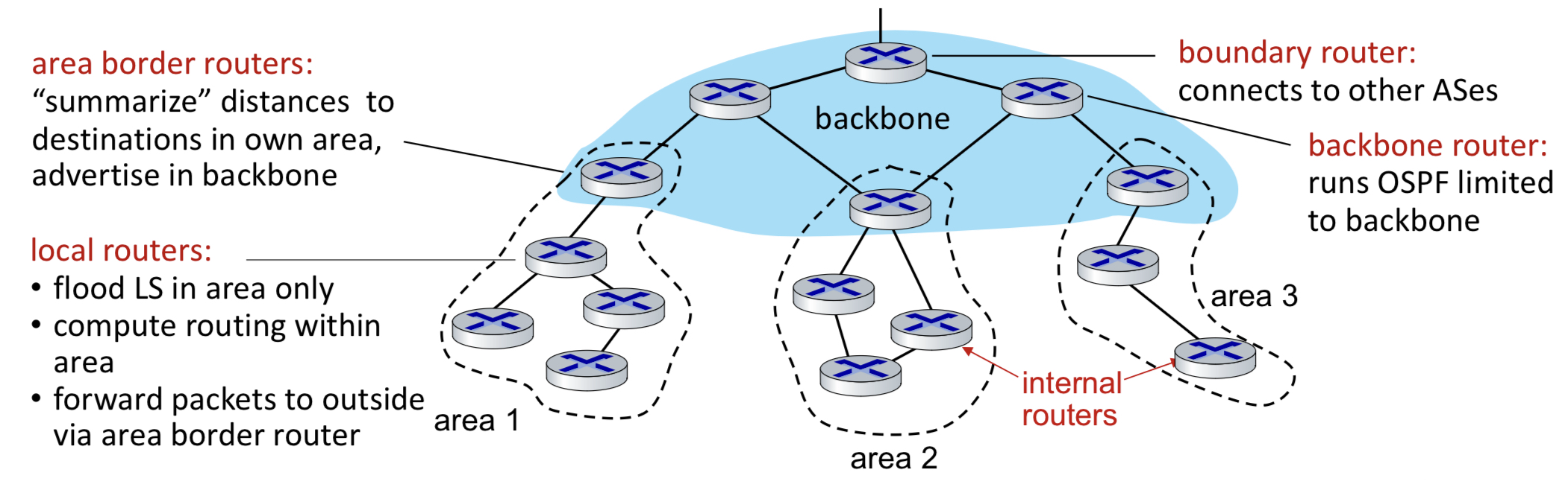 OSPF 프로토콜을 back bone 영역의 라우터들 간에만 수행하게 되면, 라우터의 개수가 줄어들 수 있어 관리에 용이해진다. 마치 subnet을 사용하는 것처럼 local area를 나누기 때문에 일종의 계층 구조라고 볼 수 있다.