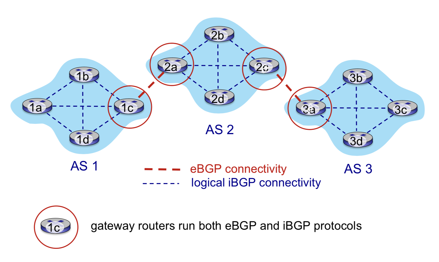 파란 부분은 각각의 AS이고 파란 점선으로 표시된 연결은 '논리적인' AS 내부의 연결이며 곧 iBGP 연결을 뜻한다. 빨간 점선은 AS 간의 연결, 즉 eBGP 연결을 의미한다.