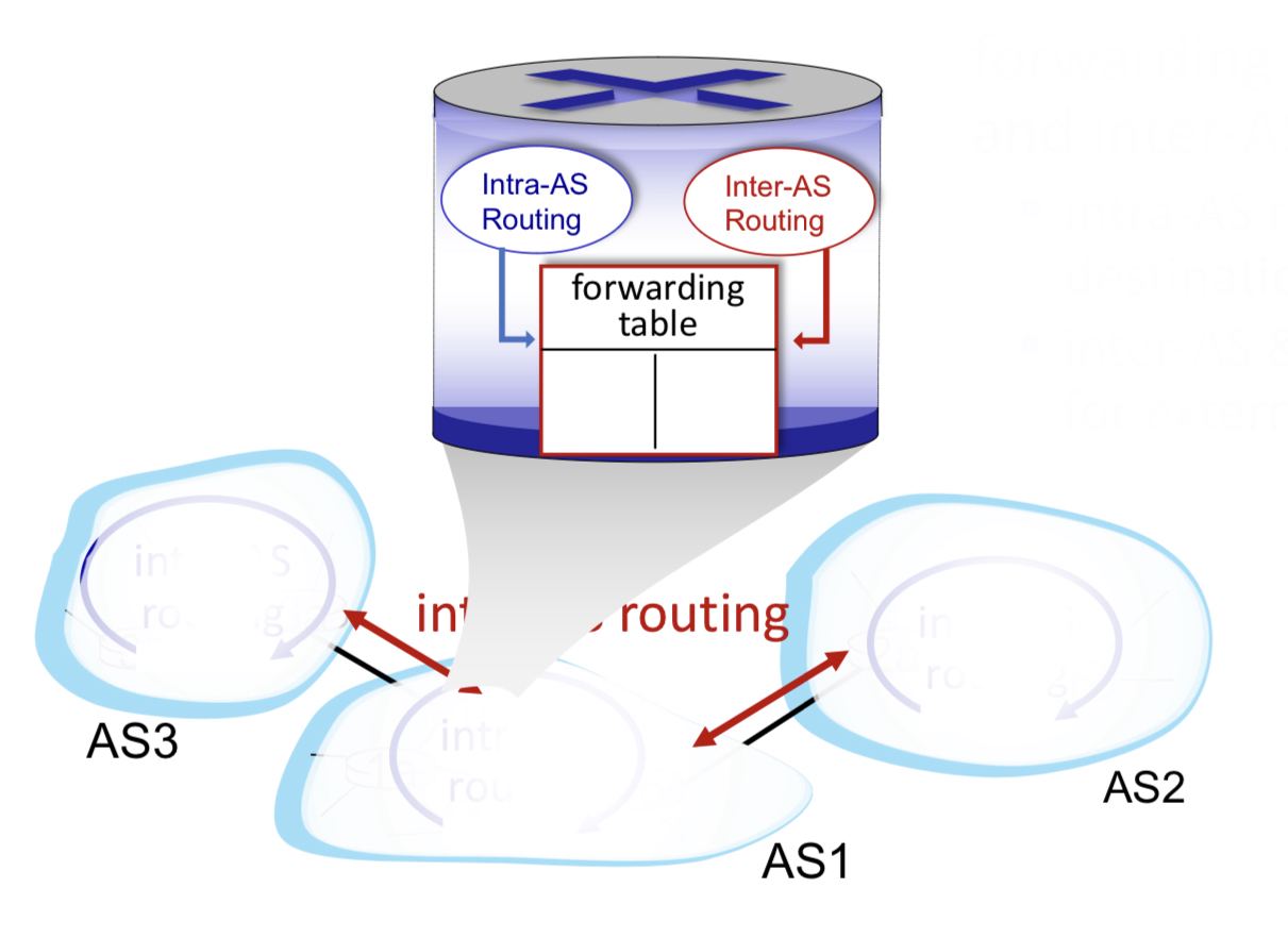 전체 네트워크를 여러 개의 AS로 나누었으면 이들 간에, 또 각각의 AS 내부에서 통신이 이루어져야 한다. 같은 AS 내부에서 이루어지는 라우팅을 Intra-AS, AS들 간의 라우팅을 Inter-AS 라 한다.