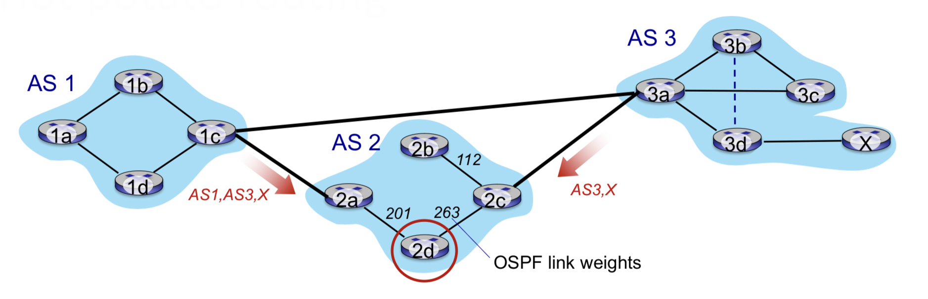 이 때 2d 라우터는 어떤 경로를 선택할 것인가? 정답은 intra-AS cost가 가장 작은 경로를 선택해야한다. 2d-2a 비용은 201이고, 2c로 가는 경로는 263이다. AS3으로 가기 위해 AS1을 거쳐야 하므로 inter-AS cost 까지 고려하면 2a -> 1c -> 3a 경로가 더 효율적이지 못하지만 내부 비용이 적기 떄문에 해당 경로를 선택한다.