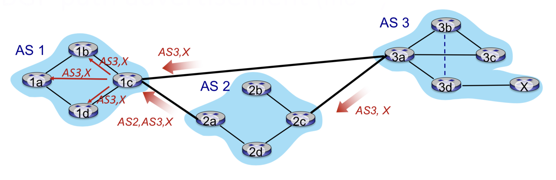 처음에는 라우터 X로 갈 수 있다라는 정보를 AS3이 AS2에게 전달한다. destination에다 자신을 앞에 붙여 AS3, X 라고 전달된다. 정보를 받은 2c 라우터는 AS 2 내부에 존재하는 모든 라우터들에게 이 정보를 flood 한다.