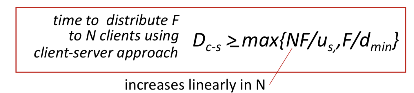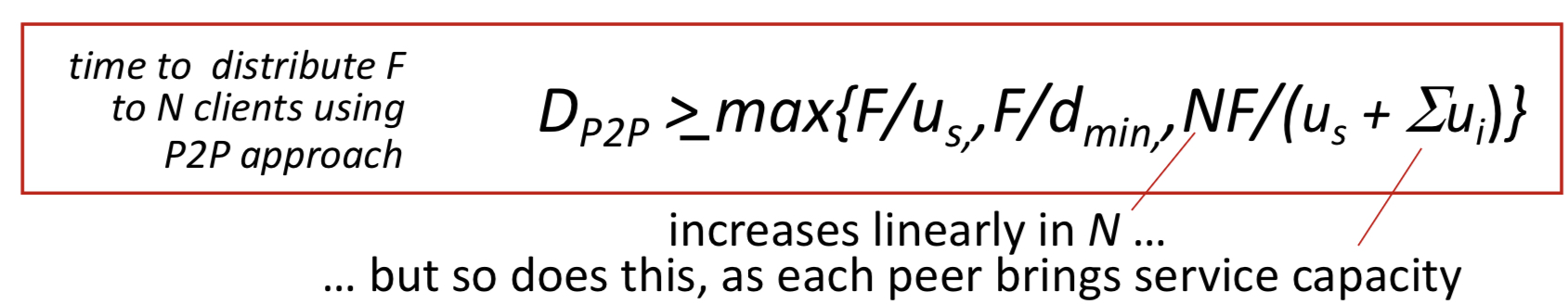 -> 클라이언트들이 동시에 다운받을 때는 가장 다운 속도가 느린 곳에서 bottleneck이 발생하기 때문에 다운로드 속도가 가장 느린 곳이 전체 속도를 결정 : F/dmin