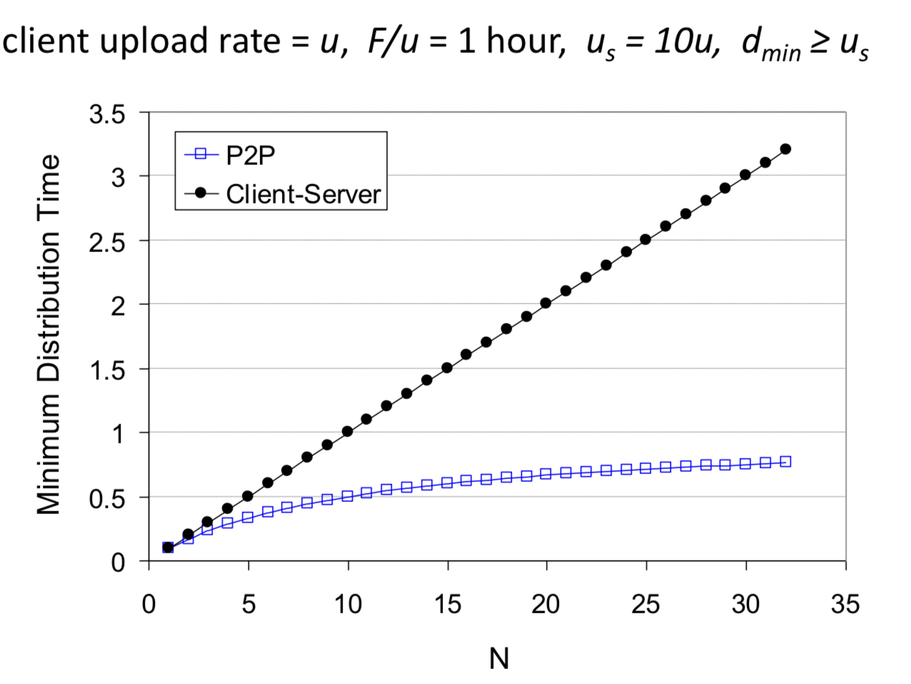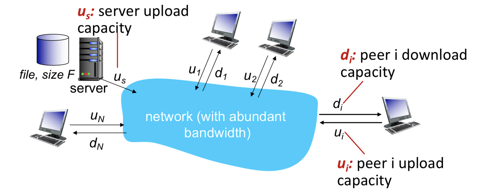 F 사이즈의 파일을 한 서버로부터 N개의 peer들에게 distribute하는데 얼마나 시간이 걸릴까?