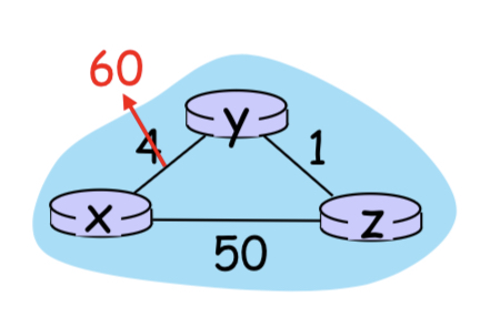 위 사진과 같은 구조로 간선 정보가 존재하고, 각 노드들은 자신의 distance vector를 완성하여 가지고 있다고 가정할 때, 간선 (x,y)의 비용이 4에서 60까지 증가했다고 가정한다.