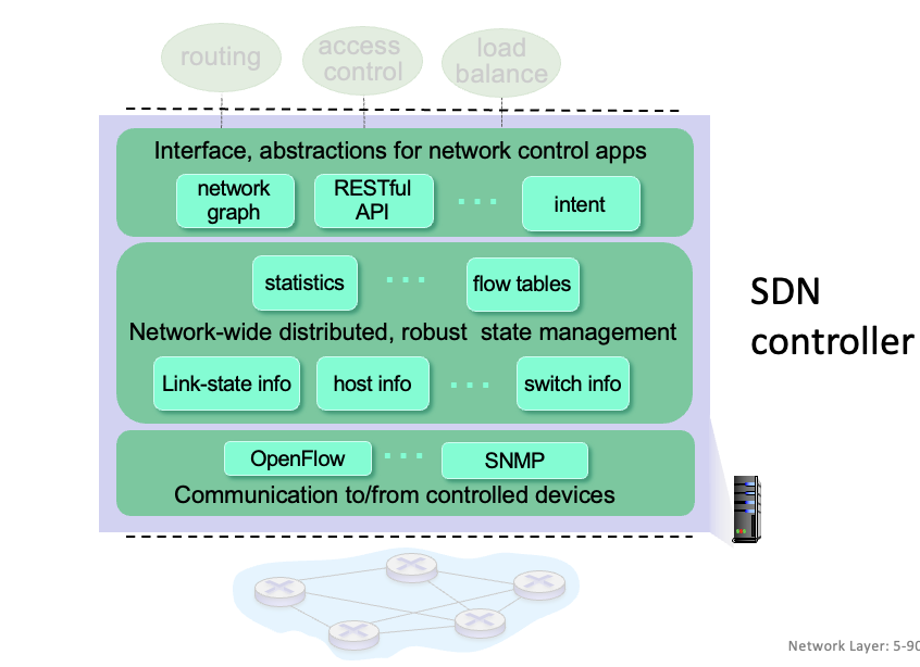 - 맨밑 layer가 SDN controlled switches와 연결되는 southbound API다