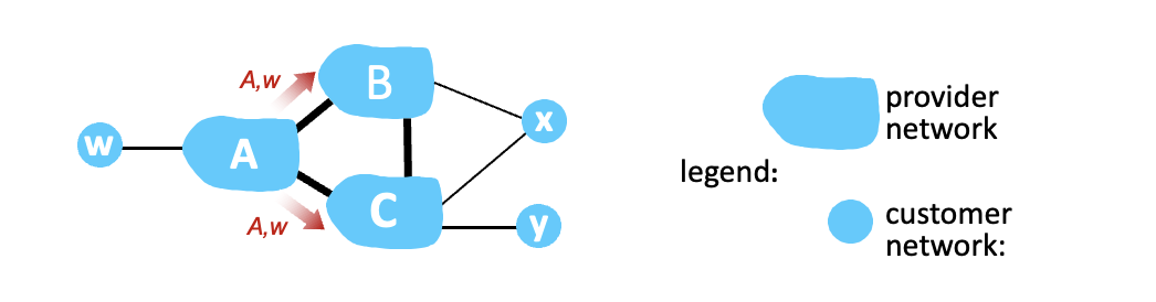 - A의 customer w에 대해 A는 B,C에게 A,w path를 광고한다