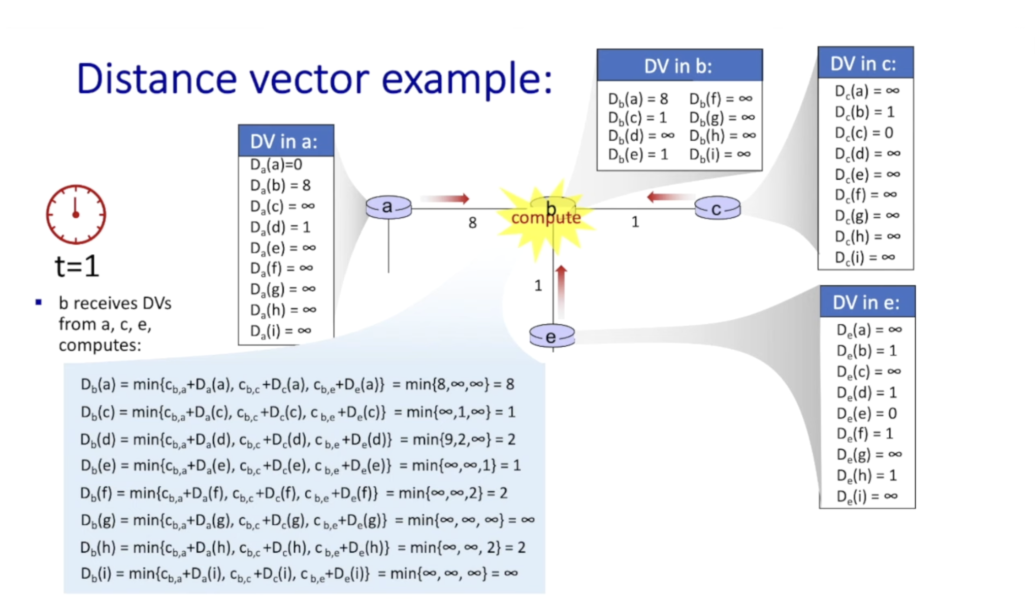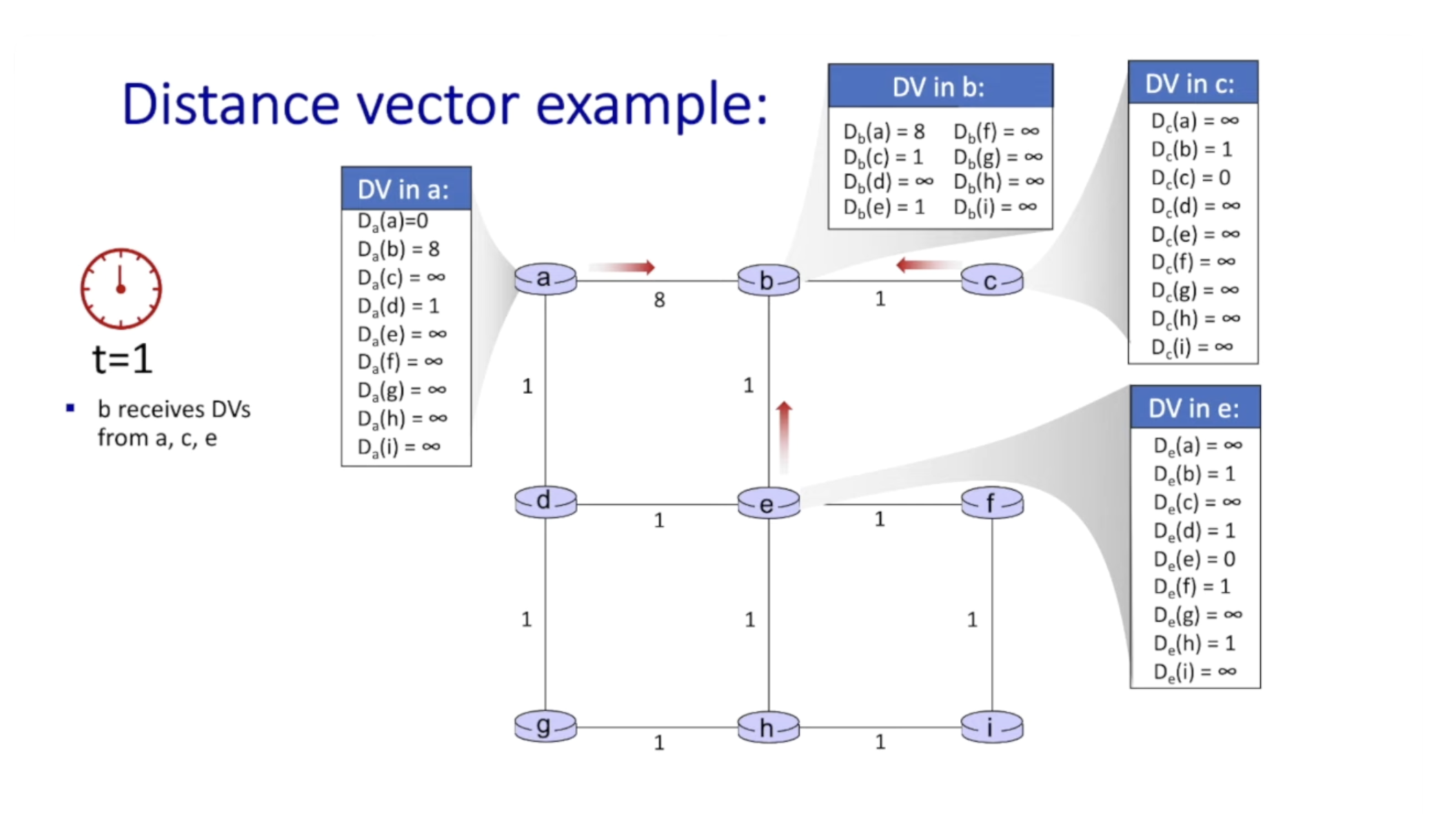 당연히 c는 b의 초기 distance vector를 받았다 (같은 t=1이기 때문!)