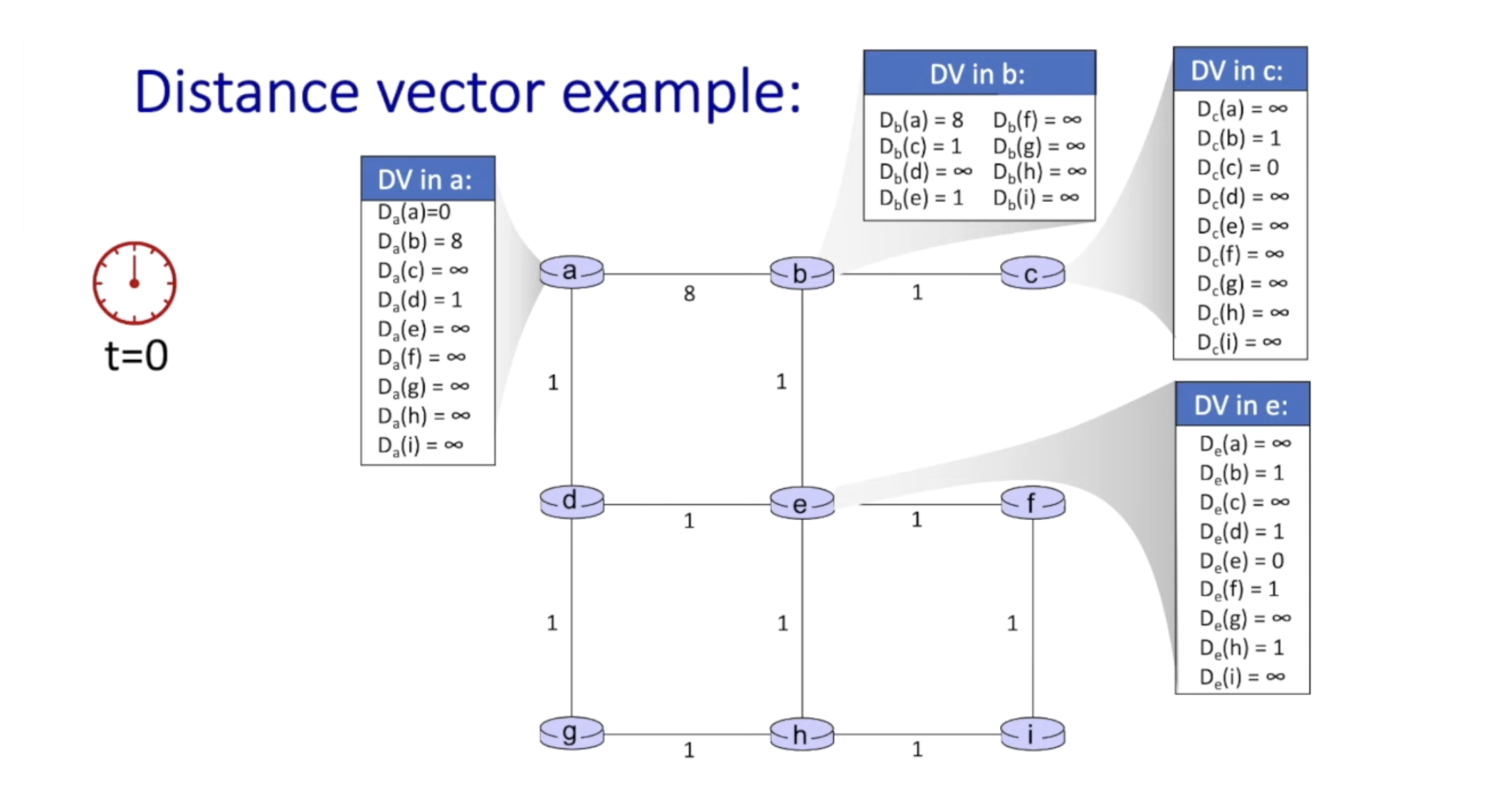 - 즉 t=2에는 자신의 distance vector는 2 hop away 라우터들의 distance vector로 부터 영향을 받기 시작한다