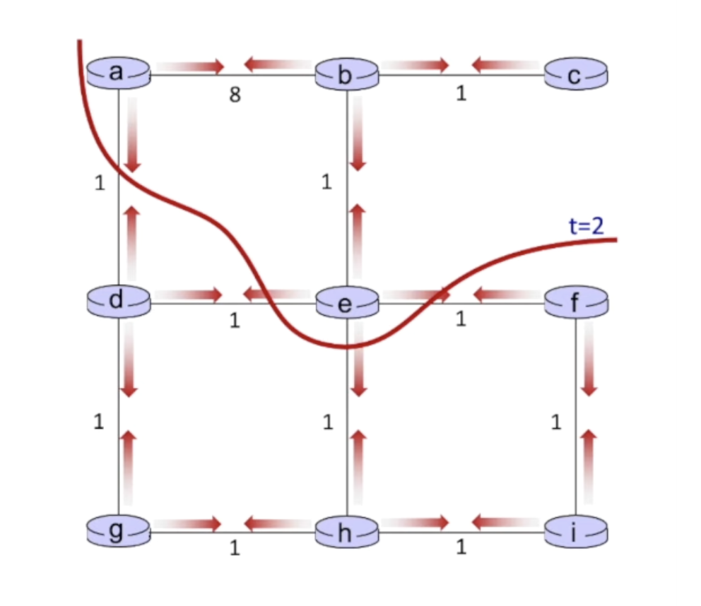 - 초기에 c는 e(<1), d는 1, b는 1 만큼의 traffic을 보유한다