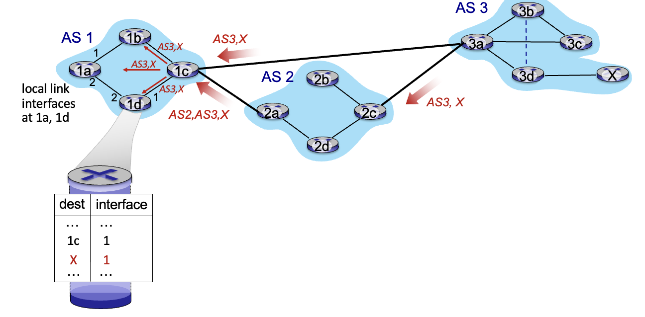 - AS2로 알리기 위해서는 AS3 gateway 3a가 AS3,X의 path를 AS2 gateway 2c로 광고한다